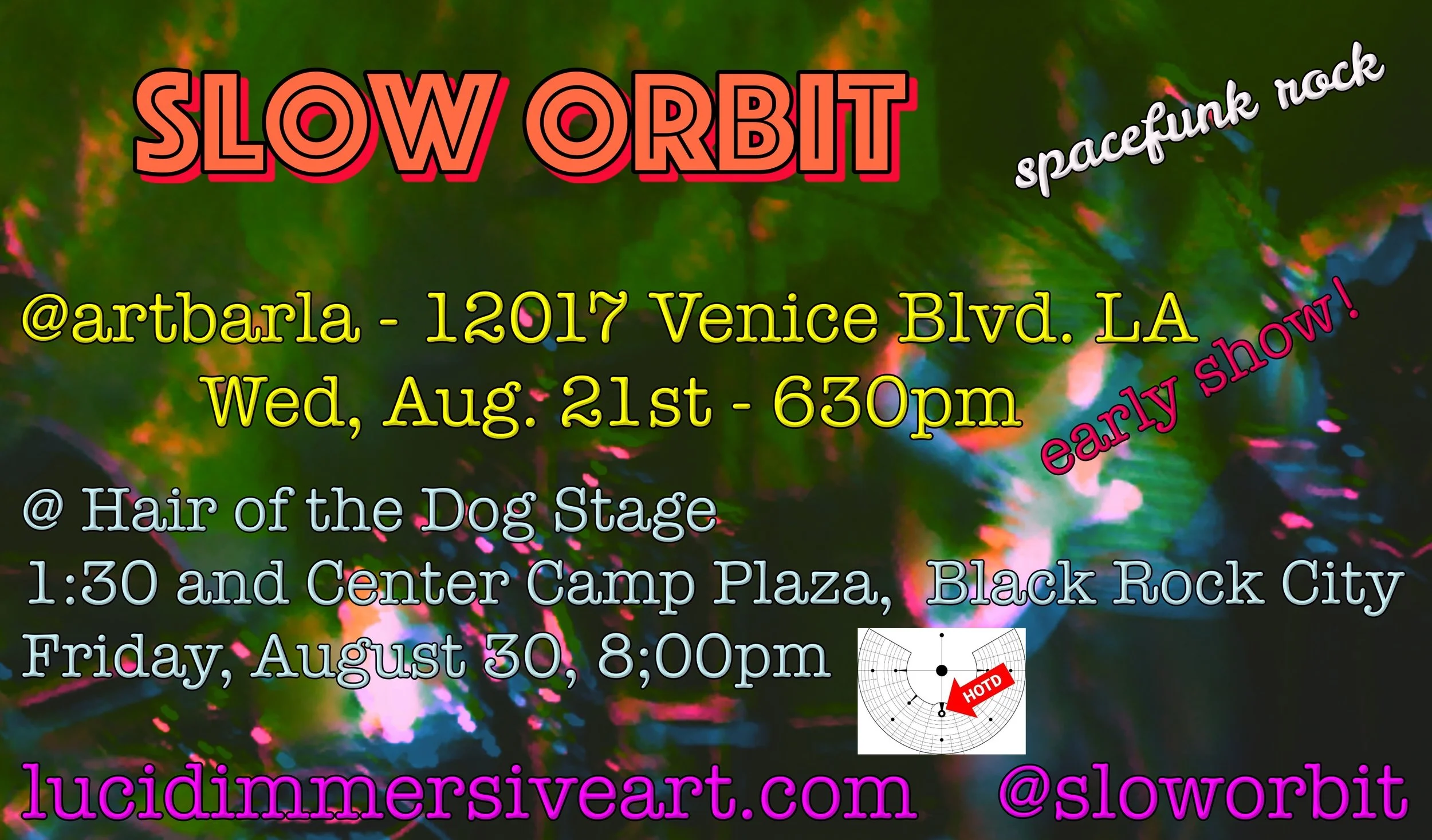 in addition to performing sets of groovy songs both solo and with guest musicians, slow orbit - in conjunction with lucid immersive - also creates ethereal, atmospheric, ambient sounds that seamlessly accompany visuals and art …to create fully immersive experiences involving instruments, dj-ing and looping to create a unique atmosphere and sonic story each time.